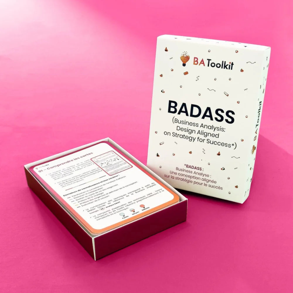 BADASS pour (Business Analysis : Design Aligned Strategy for Success), autrement dit, ce deck est le parfait assistant pour créer une stratégie visant la réussite de tout projet dans le domaine professionnel.